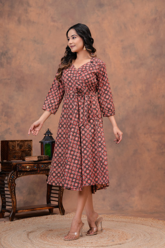 This couple is wearing a stylish and vibrant matching set that perfectly balances traditional Indian design with modern casual wear. The outfits feature a striking black and red motif, applied using classic hand block printing techniques, giving them an authentic, artisanal feel. Crafted from lightweight and breathable cotton fabric, these garments are designed for comfort and ease of movement, making them ideal for a warm weather event, a festive occasion, or a casual date night. The woman's A-line midi dress and the man's complementary short-sleeve shirt create a harmonious 'twinning' look that is both fashionable and rooted in cultural heritage