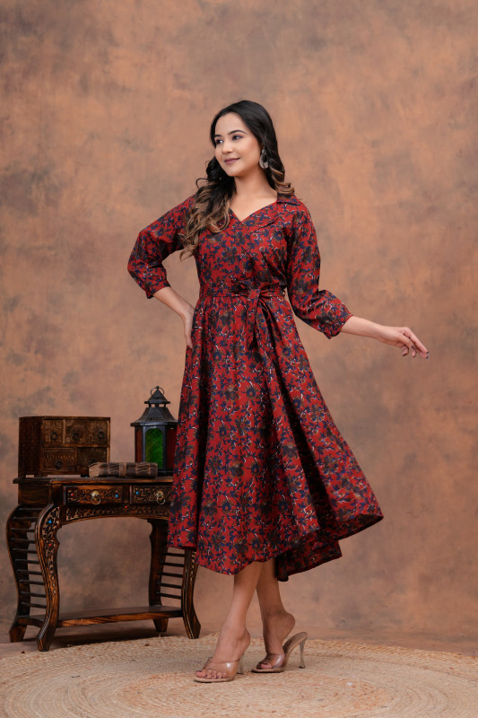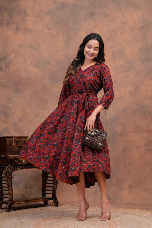 • Design & Pattern: The outfits feature intricate floral and leafy motifs in a deep red and black color palette. The pattern is often applied using the traditional Indian technique of hand block printing, a process that highlights artisanal skill and results in unique designs.