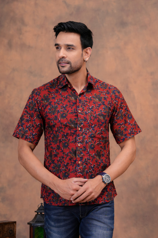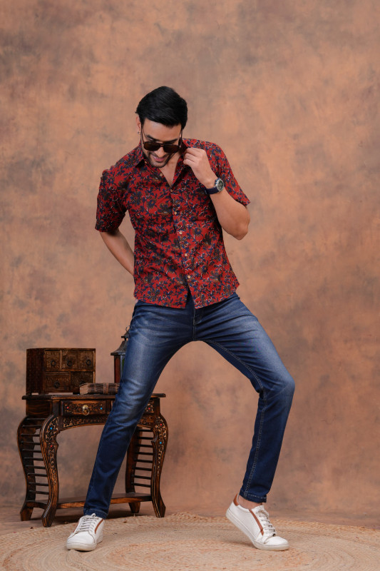 This exquisite matching couple's set is crafted from soft, breathable cotton fabric, featuring a striking red and black floral print design. It offers a harmonious blend of traditional Indian textile artistry and contemporary casual fashion, perfect for a coordinated and stylish appearance.