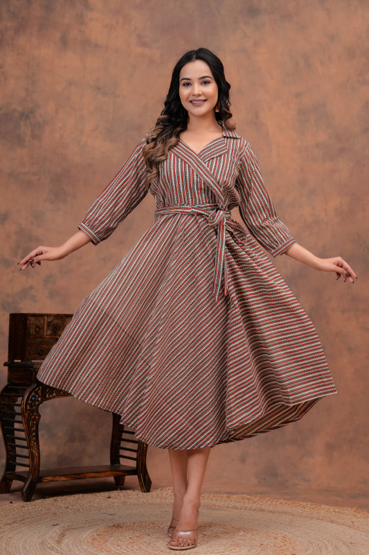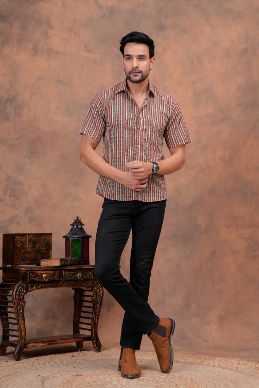 This couple's ensemble is a stylish and coordinated set crafted from soft, breathable cotton fabric, featuring a rich red and brown striped/geometric print design. The outfits offer a harmonious blend of traditional artistry, often using hand block printing techniques, and contemporary casual fashion. The lightweight material ensures comfort for extended wear in warm weather or during various occasions. The woman's dress presents a flattering A-line midi silhouette, typically with a V-neck and a tie-up waist belt, while the man's complementary short-sleeve shirt offers a relaxed yet smart fit, creating a perfectly synchronized and visually appealing look for the couple