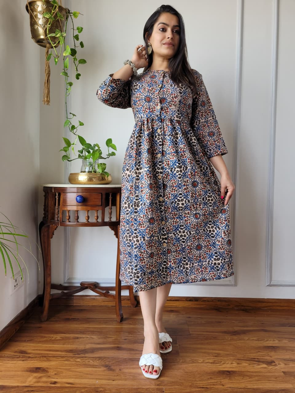 The dress features a neutral beige or off-white base color adorned with intricate floral and abstract motifs in contrasting shades of rust red and blue. These patterns are created using the time-honored hand block printing technique, where skilled artisans in regions like Rajasthan use hand-carved wooden blocks and natural dyes to stamp the fabric. This process ensures each piece is unique and carries significant cultural heritage.
