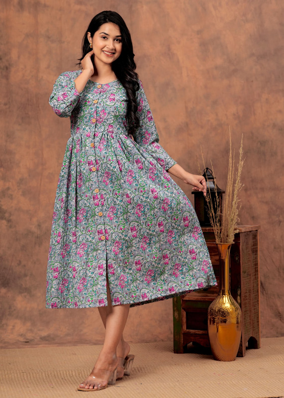 Embrace timeless beauty and exceptional comfort with our Beige & Maroon Blossom Midi Dress. This piece is a celebration of traditional Indian textile art, featuring a rich Maroon floral/leaf pattern meticulously hand-stamped onto a soft, natural Beige base. Crafted from pure cotton, this dress is the perfect blend of ethnic charm and contemporary style.