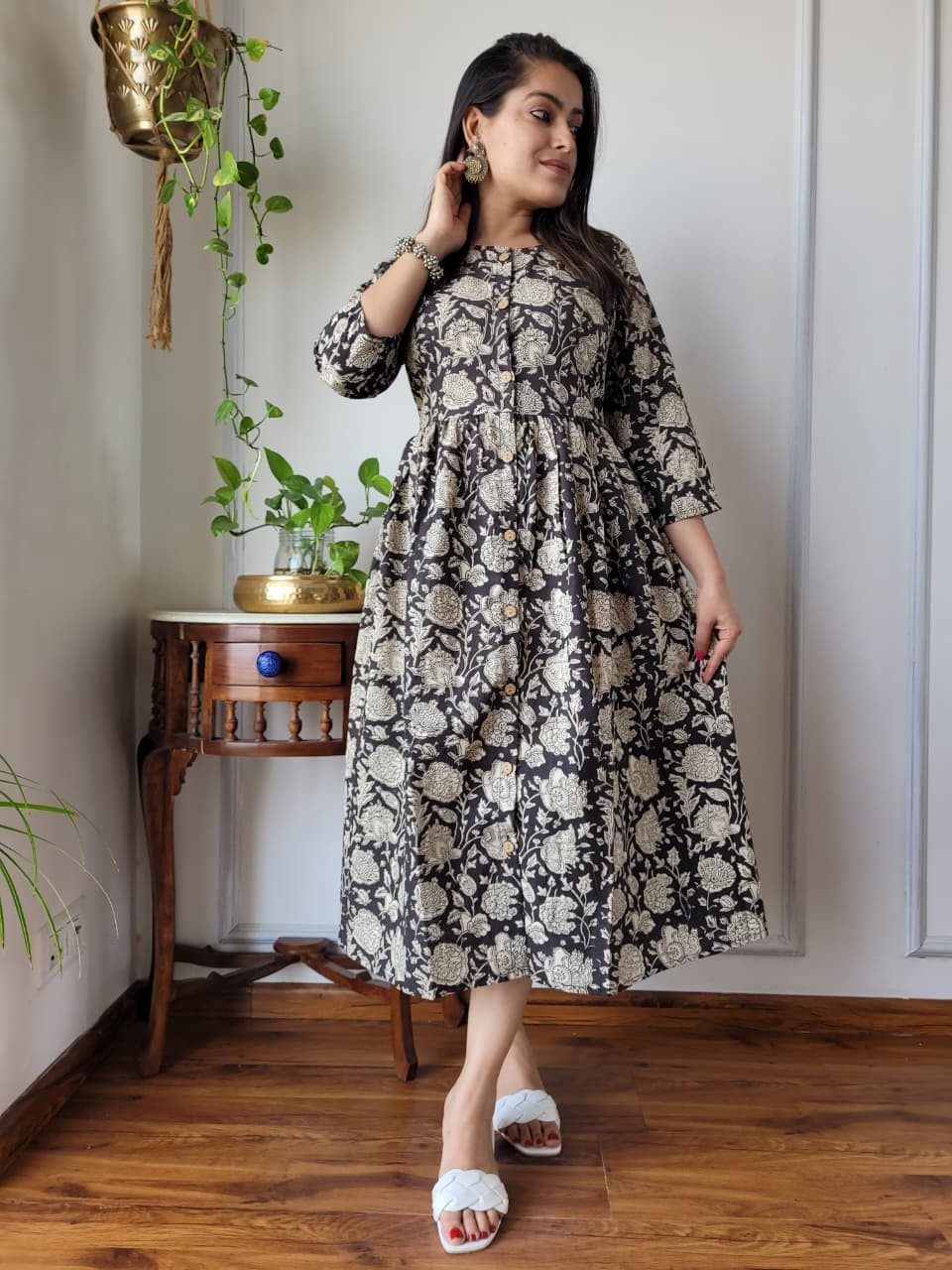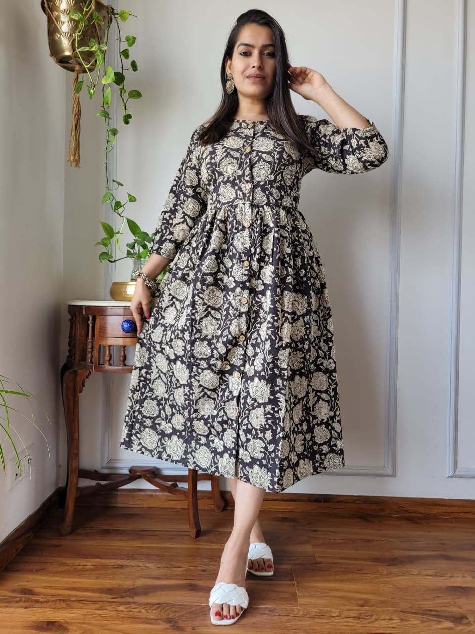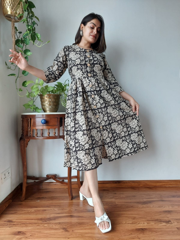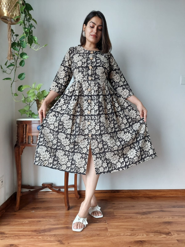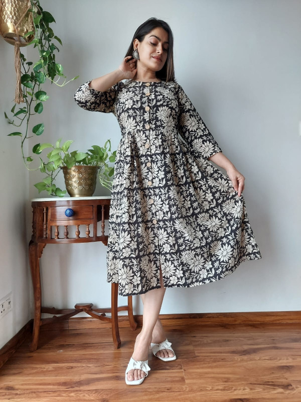 This black and beige/white floral hand block printed cotton one piece dress is a sophisticated and comfortable garment that beautifully encapsulates traditional Indian craftsmanship in a modern silhouette. Crafted from high-quality, breathable cotton cambric fabric, it offers a soft, lightweight feel, ensuring maximum comfort for all-day wear. The dress features a deep black base color adorned with intricate floral and botanical motifs in a contrasting beige or off-white hue. These patterns are created using the time-honored hand block printing technique, where skilled artisans use hand-carved wooden blocks and natural dyes to stamp the fabric, giving each piece an authentic, artisanal touch. The design follows a flattering A-line silhouette, meaning it is fitted at the bodice and flares out gently toward the hem, providing graceful movement and a relaxed yet elegant fit. Key design details include a classic round neckline, a functional partial front button placket closure with contrast buttons, and three-quarter length sleeves. This versatile cotton dress is ideal for a variety of settings, from casual outings and brunches to office wear or evening gatherings, offering both elegance and ease.