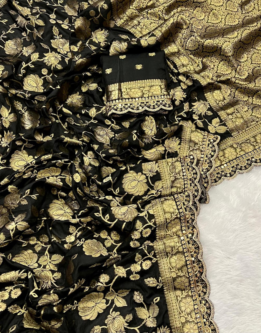 This ensemble features elegant, striking black and gold ethnic outfits, crafted from luxurious Khaddi Georgette material and adorned with a traditional floral brocade design. The rich black base provides a dramatic backdrop for the intricate gold metallic (zari) thread work, creating a sophisticated and eye-catching aesthetic. The use of Khaddi Georgette, prized for its lightweight texture, exceptional soft drape, and subtle sheen, makes the outfits comfortable to wear while maintaining an opulent look. The design, often referred to as "flower jaal" or "bootidaar," showcases meticulously woven floral patterns across the entirety of the fabric, reflecting skilled craftsmanship. The combination of the classic color palette, rich gold work, and flowy material makes these outfits ideal for formal events, evening parties, weddings, and traditional functions, offering a perfect blend of elegance and cultural charm.