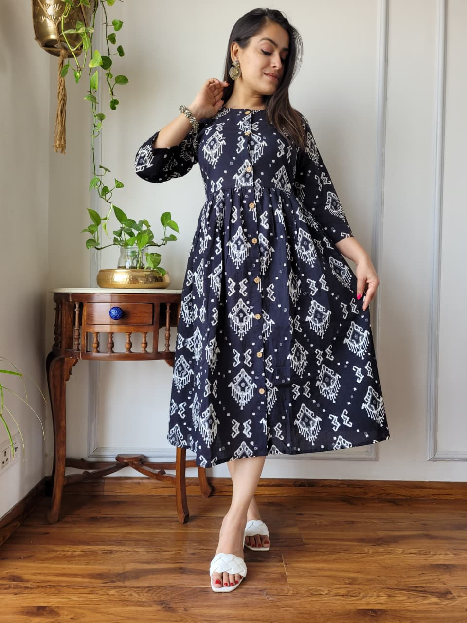 This black and white Ikat print cotton A-line one piece dress is a beautiful garment that seamlessly blends traditional Indian textile artistry with a comfortable, contemporary silhouette. Crafted from 100% pure cotton cambric fabric, it offers a soft, breathable, and lightweight feel, making it ideal for all-day wear.