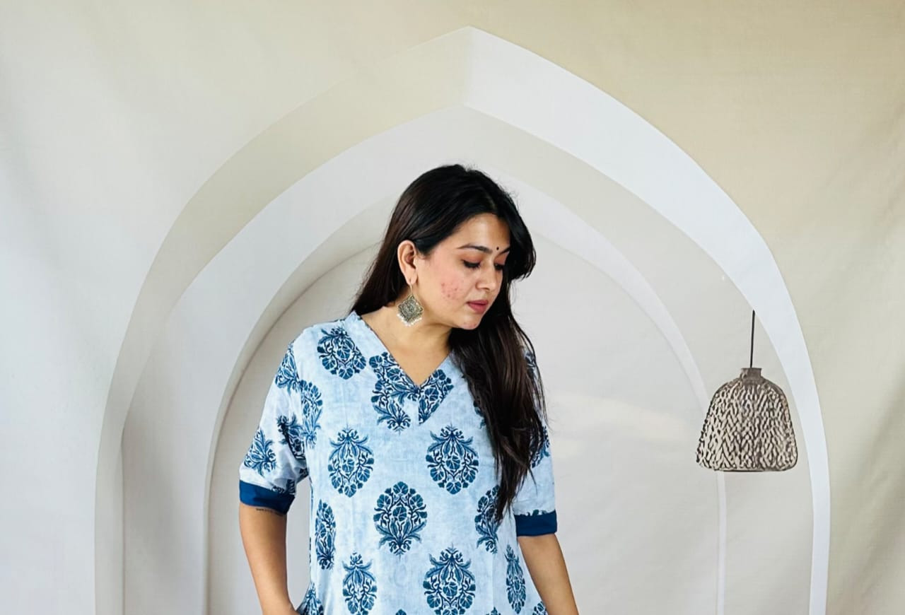 This versatile A-line kurti or short dress effortlessly blends ethnic artistry with a relaxed, modern silhouette. The free-flowing, flared style provides ease of movement, and the flattering V-neckline and functional side pockets add practicality for daily use. This piece can be worn as a standalone dress or, as shown in the image, paired with contrasting black leggings or white trousers for a complete and elegant everyday ensemble.