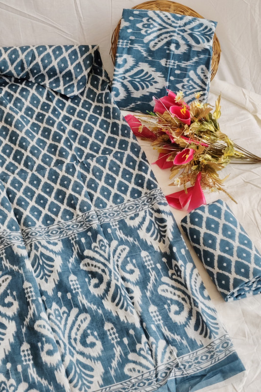 This blue and white ikat print pure cotton unstitched suit material for women offers a blend of style and comfort, designed to be tailored to your precise measurements and preferences. Crafted from premium quality pure cotton, the fabric is breathable, soft, and ideal for all-day wear in various seasons. The set includes a generous 2.5 meters of fabric each for the top, bottom, and dupatta, providing ample material to fashion an array of ethnic outfits, from a traditional salwar kameez to a modern kurti with palazzo pants. The distinctive ikat pattern in a fresh blue and white color combination adds a contemporary yet classic aesthetic, making this material a versatile choice for both casual outings and festive occasions