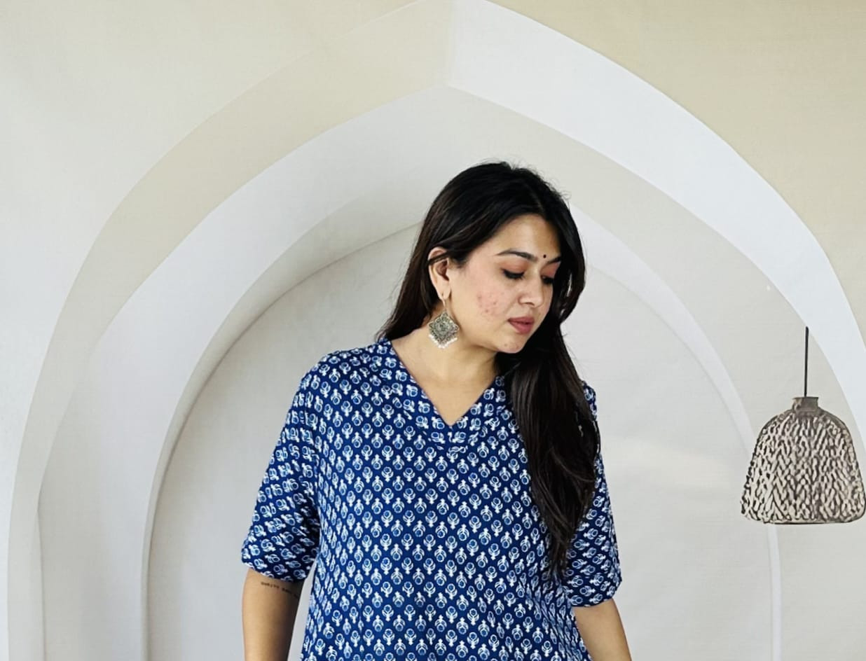 This A-line kurti offers a comfortable and chic blend of ethnic tradition and modern style. The free-flowing, flared silhouette provides ease of movement, and the flattering V-neckline complements various body types. The functional side pockets add practicality. This versatile piece can be worn as a standalone dress or paired with contrasting black leggings, as shown, or white trousers for a complete and elegant everyday ensemble.