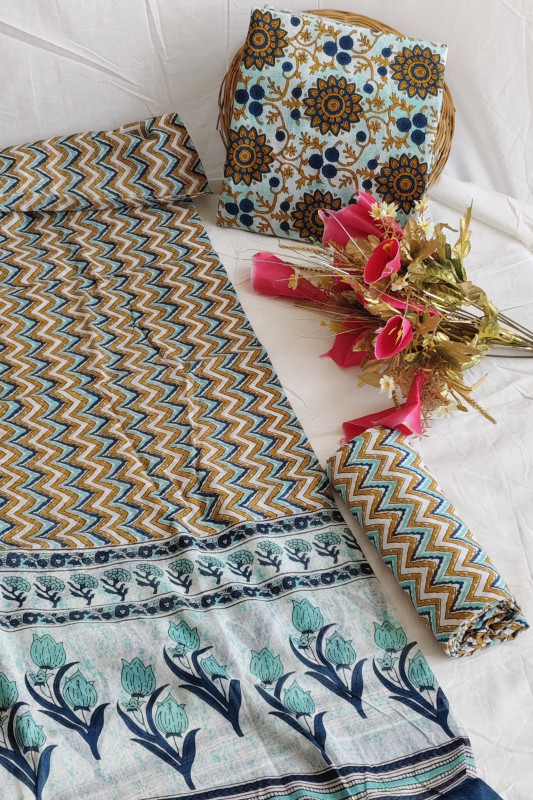 This Blue Yellow White Hand Block Print Cotton Unstitched Suit Set (Zigzag and Floral Motifs) is a vibrant and comfortable choice for a woman's ethnic wardrobe. Crafted from pure, breathable cotton fabric, this traditional three-piece set ensures comfort and a regular fit, making it suitable for casual wear, office settings, or daily use. The unstitched format provides the flexibility to customize the design and fit according to personal preference. The material features two distinct, complementary hand block printed patterns: the top and bottom materials display a bold, contemporary chevron or zigzag geometric pattern in shades of blue, yellow (mustard/gold), and white, while the coordinating dupatta (scarf/shawl) provides a traditional contrast, adorned with delicate floral motifs in similar colors, adding an elegant and soft touch to the ensemble. This set celebrates artisanal techniques, with potential slight irregularities in motifs, textures, and colors inherent to the hand block printing process, which enhance its authentic charm.