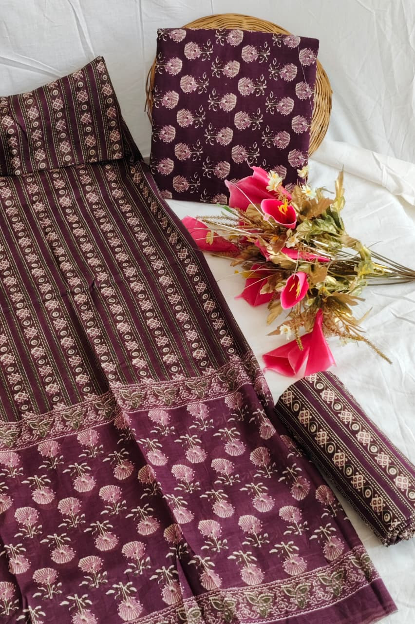 This Classic Purple Hand Block Printed Unstitched Suit Material for women is crafted from premium, breathable cotton fabric, ensuring both comfort and style. The set includes generous 2.5-meter lengths each for the top, bottom, and dupatta, offering ample material to be tailored to your desired fit and style. The beautiful wine or purple base color serves as a rich canvas for the intricate white and off-white hand block prints.