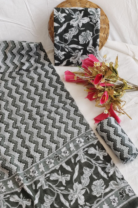 This cotton unstitched suit set is a versatile and stylish outfit material for women, crafted entirely from comfortable, breathable cotton fabric. The overall color palette is a sophisticated combination of deep forest green (or dark olive green) and crisp white, offering a classic yet contemporary look. The material is typically sold as a three-piece set, comprising fabric for the kurta (top), a matching or contrasting bottom (salwar, churidar, or trousers), and a coordinating dupatta (scarf/shawl). This type of textile is widely popular in South Asian fashion due to its comfort and ease of customization to a desired fit.