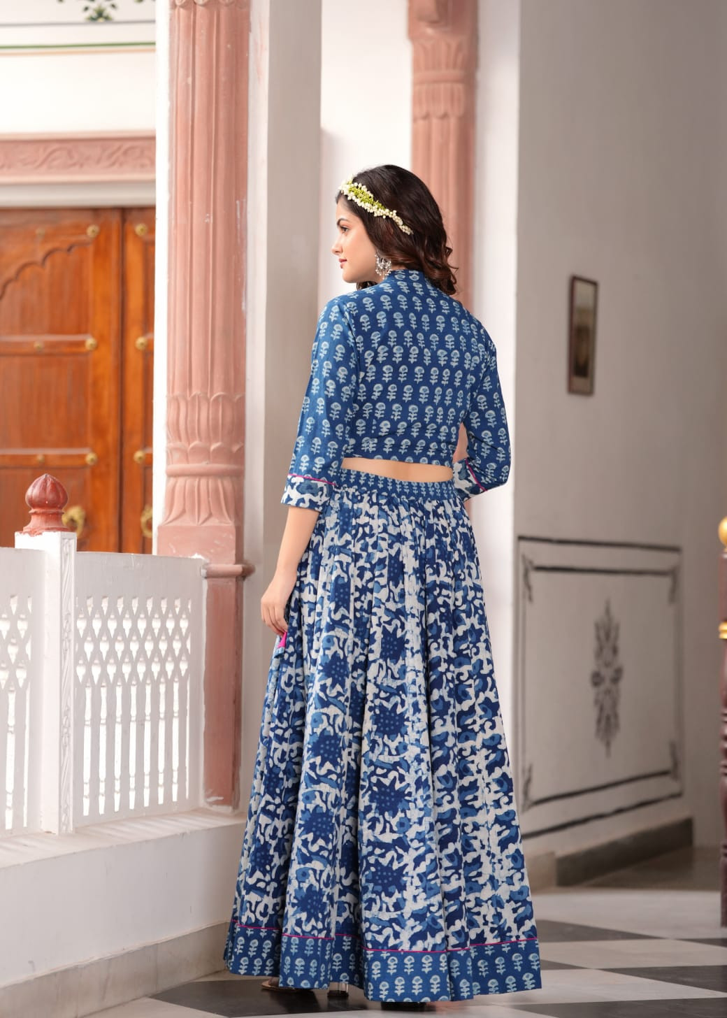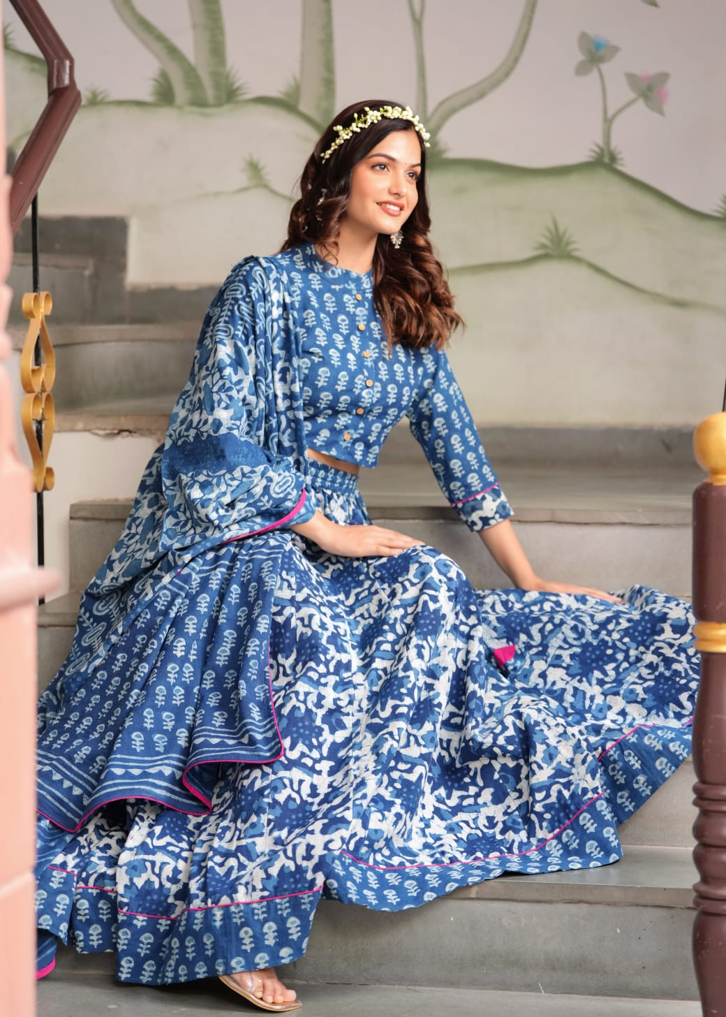 This authentic ethnic ensemble highlights the beauty of traditional Indian textiles with its deep blue color and intricate Bagru block prints depicting forest scenes with deer and trees. The set consists of a 15 to 16-inch crop top adorned with small floral motifs, a mandarin collar, and a button-down front, suitable for sizes 36 to 46 (S to 3XL). The matching skirt is 40 inches long and is crafted with 28 kalis to create a voluminous 5.5-meter flair that showcases the detailed animal patterns as you move. Completing the look is a 2.5-meter dupatta with coordinated printed borders, making this cotton outfit a culturally rich and comfortable choice for festive occasions.