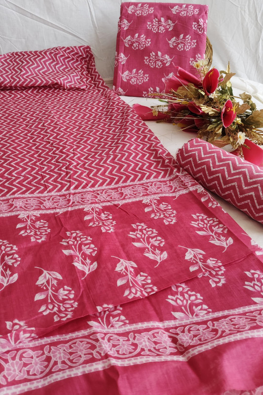 This unstitched suit material is crafted from high-quality, breathable fuchsia pink hand block print cotton fabric, renowned for its comfort, making it a perfect choice for daily wear or casual outings. The traditional hand block printing technique, a centuries-old art form from places like Jaipur, Rajasthan, creates intricate and unique patterns, which add an authentic, artisanal charm to the ensemble.