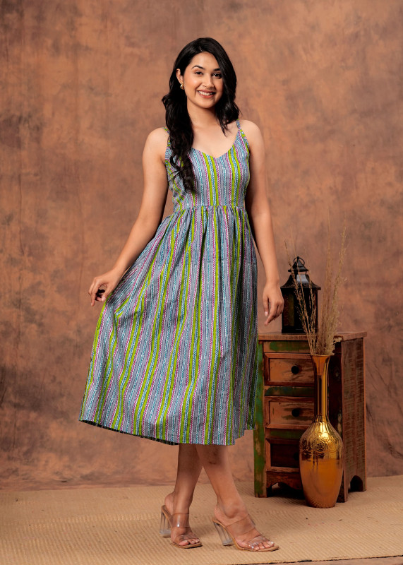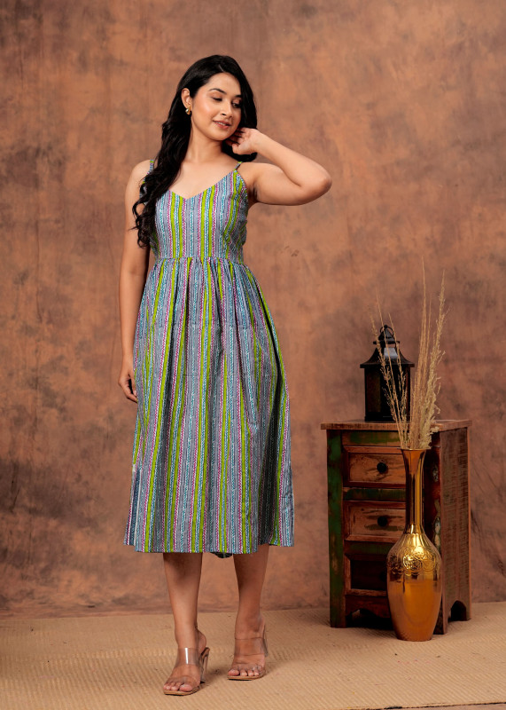 Refresh your style with this sophisticated grey midi dress featuring vertical stripes in vibrant green and purple tones. The sleeveless design highlights a V-neckline with thin shoulder straps and a gathered waist that flows into a relaxed A-line skirt. Ideal for casual wear or daytime events this dress offers a slimming effect due to the vertical patterns and ensures comfort with its breezy fabric making it a perfect match for clear heels or flats.