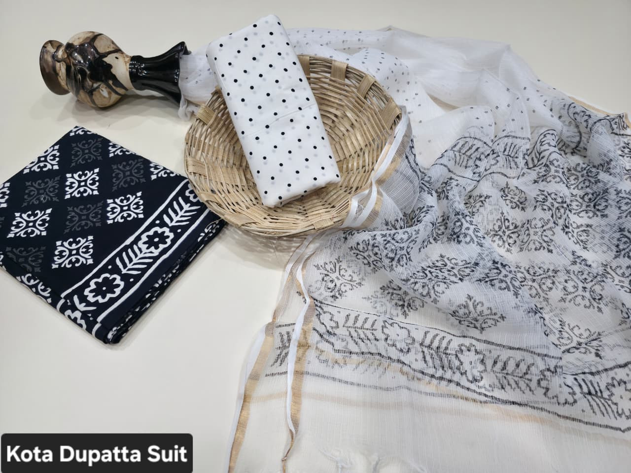 Grey and White Hand Block Print Cotton Suit with Kota Doria Dupatta.