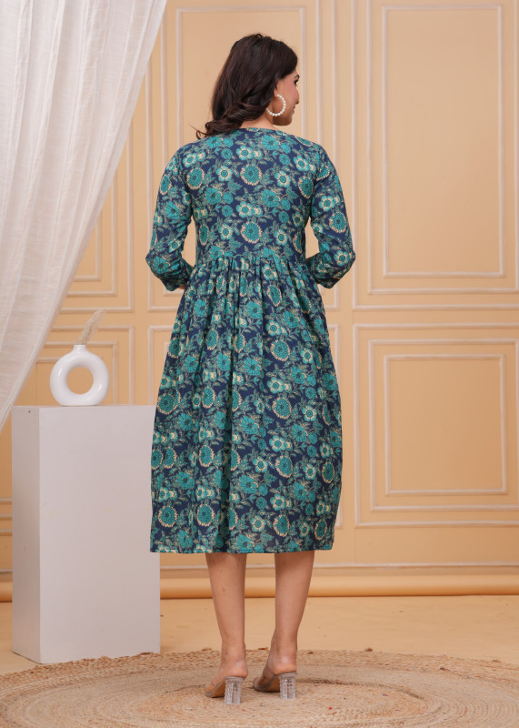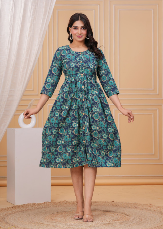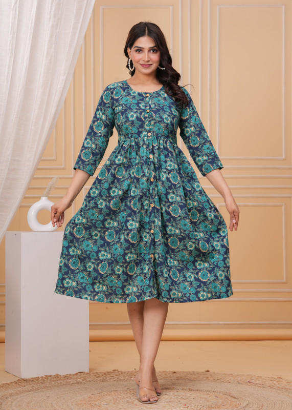 The silhouette features a flattering Anarkali-style fit and flare cut that is fitted at the bodice and gathers at the high waist, creating a generous, swirling skirt. Key details include a functional wooden button placket running down the front, a classic round neckline, and versatile 3/4th length sleeves.