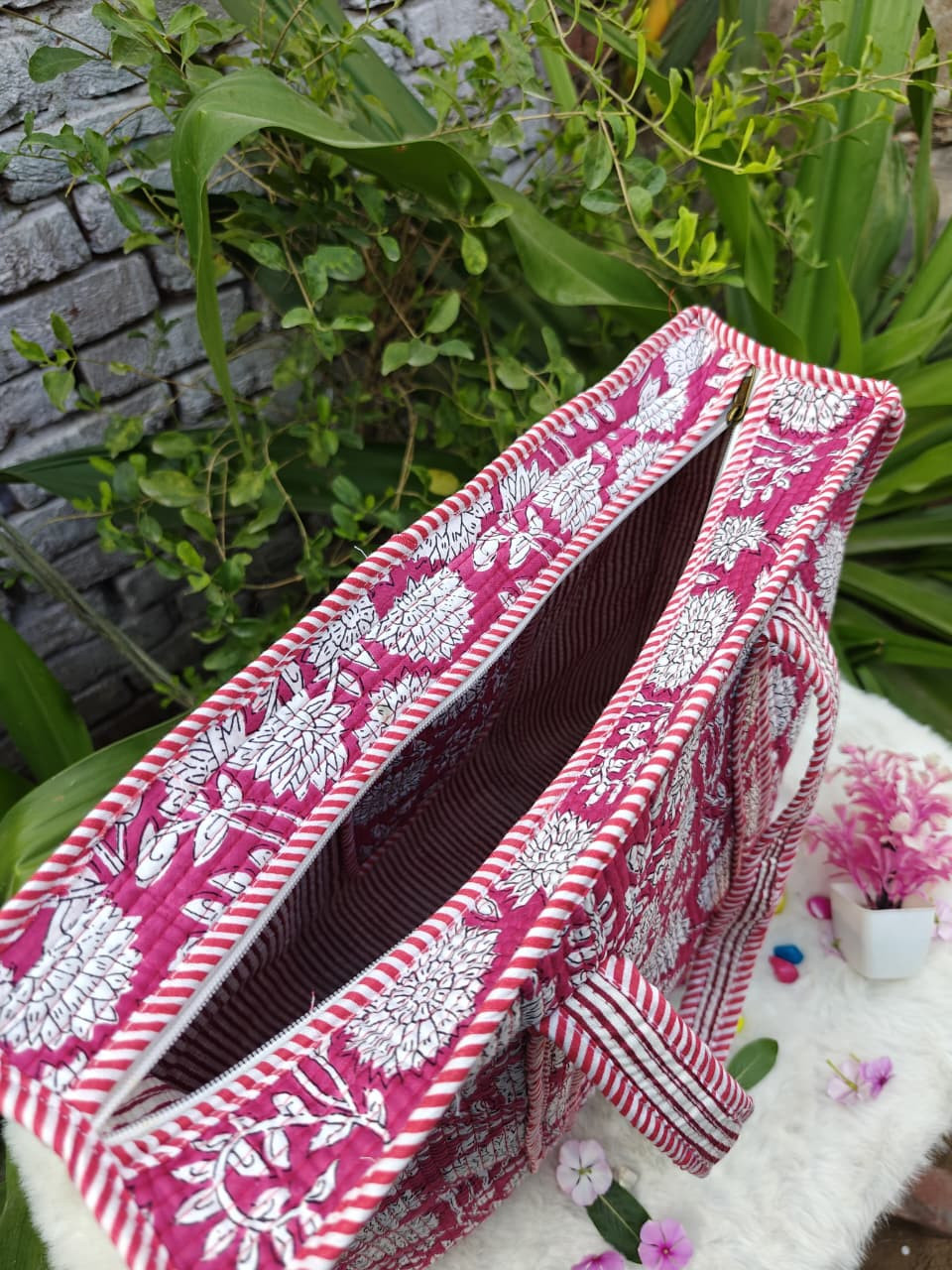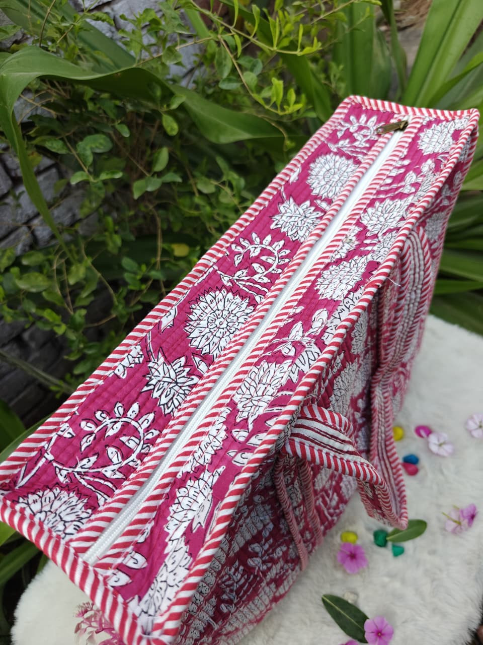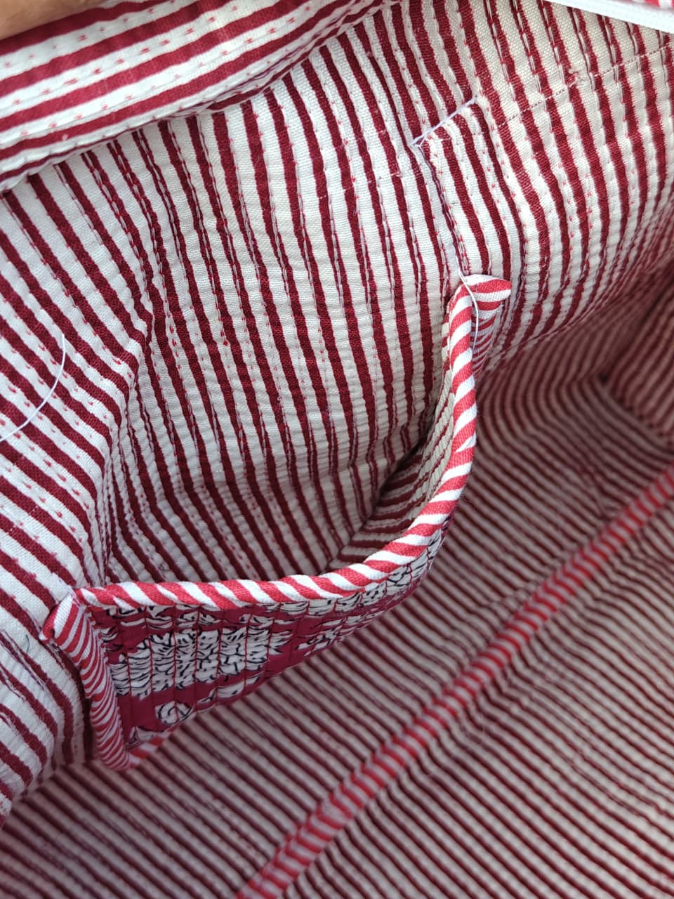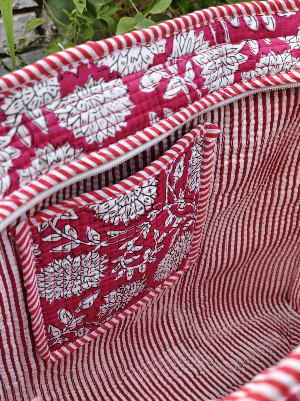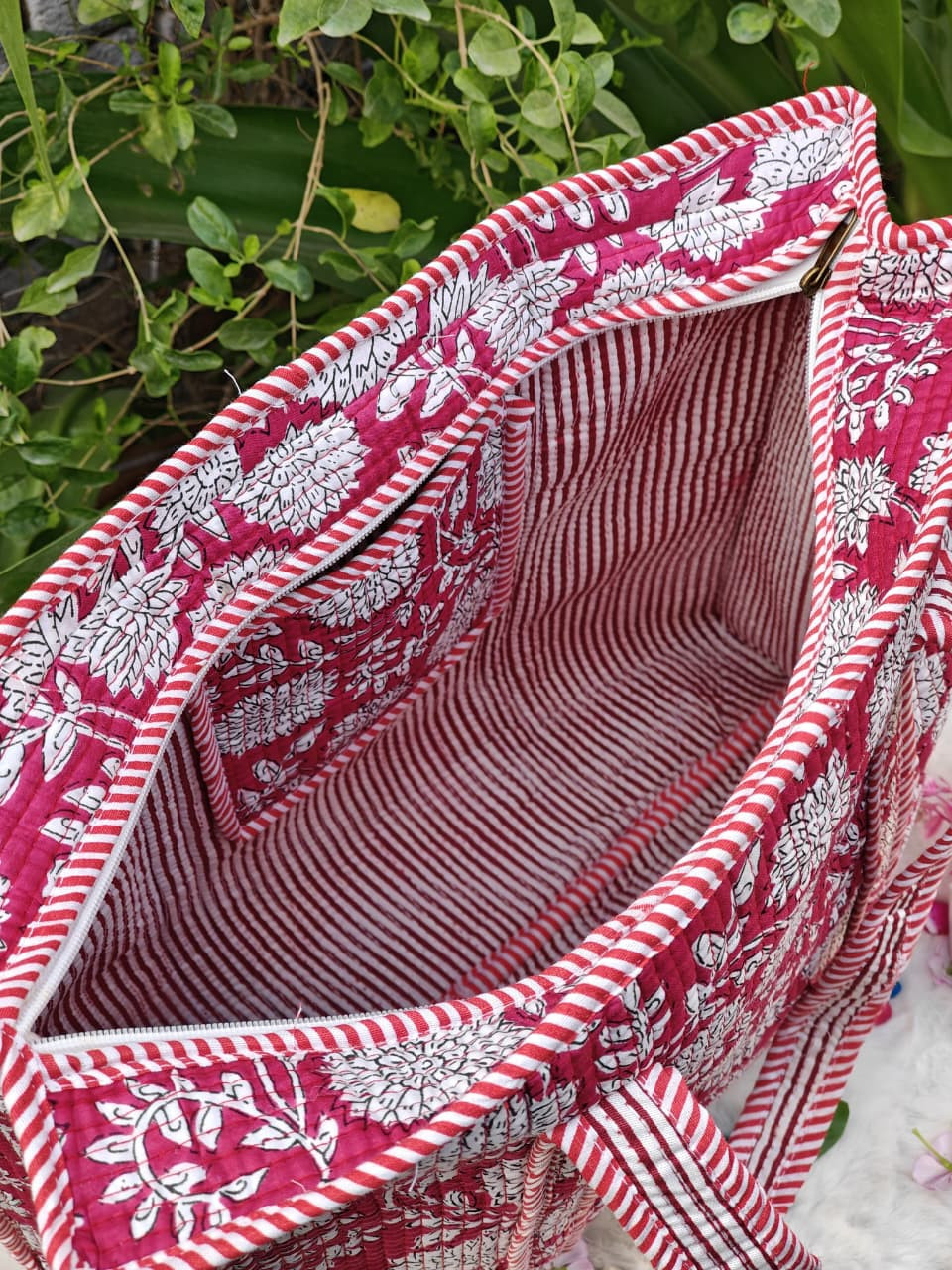 Design & Material: The bag features an attractive Hampton Red Floral hand-block printed design, printed on both sides (reversible style). The quilting gives it a premium look and added durability.