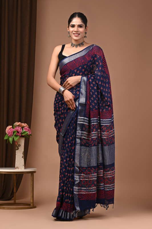 Drape yourself in the rich cultural artistry of this Indigo Blue & Red Hand Block Print Linen Saree. This exquisite piece is a celebration of traditional printing techniques, where skilled artisans use hand-carved wooden blocks to create intricate, timeless patterns. Crafted from premium, breathable linen fabric, the saree offers a lightweight feel and a sophisticated drape, ensuring comfort throughout any occasion. The striking color palette of deep indigo blue and vibrant red provides a captivating visual appeal, perfectly complemented by a subtle silver-toned border. This elegant ensemble is ideal for festive wear, cultural events, or making a chic daily statement, embodying a perfect blend of heritage and contemporary style.