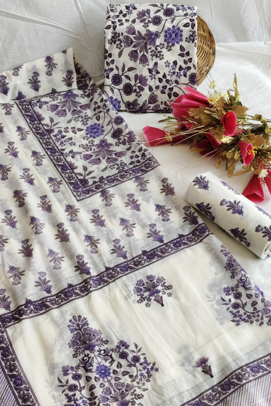 lavender and white floral printed cotton unstitched suit set. Crafted from premium, breathable cotton fabric, this ensemble ensures all-day comfort and a soft, comfortable feel against the skin. The design features delicate, intricate floral patterns that reflect traditional craftsmanship and a timeless aesthetic. It is a complete unstitched set, coming with 2.5 meters of top fabric, 2.5 meters of bottom fabric, and 2.5 meters of matching dupatta, giving you complete freedom to tailor it to your preference – whether it's a classic salwar kameez, a chic palazzo suit, or a contemporary A-line ensemble. This versatile dress material is perfect for various occasions including casual outings, office wear, and small gatherings