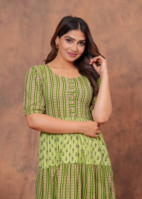 Revitalize your summer style with this delightful light green midi dress that creatively mixes vertical stripes with dainty floral block prints in pink and dark green. The dress features a structured bodice with a central button placket and elbow-length sleeves that provide a comfortable and modest fit. Its tiered A-line skirt creates a playful and flowy silhouette that is perfect for breezy days making it a standout choice for casual wear when matched with transparent heels or comfortable flats.