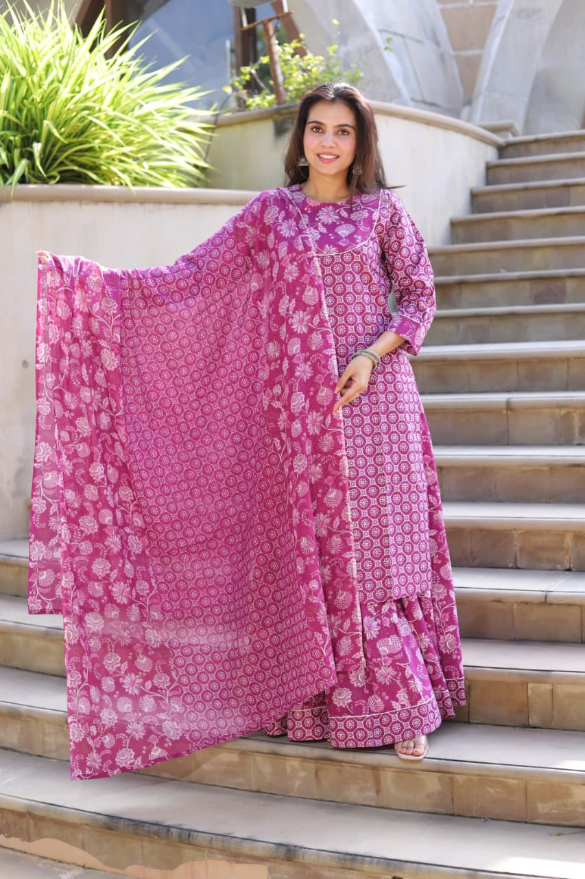 | This elegant two-piece ethnic ensemble showcases a long, A-line or flared kurta in a rich magenta hue, adorned with intricate hand-block printed white motifs across the fabric, including a distinct pattern on the bodice and a different design on the lower flare. The kurta features three-quarter sleeves and a round neckline. It is paired with a matching flared bottom, which could be a skirt or wide palazzo pants, completing a cohesive and stylish look. This outfit blends traditional Indian style with contemporary fashion, offering both comfort and a sophisticated appearance without the need for a separate dupatta. It is a versatile choice for a range of occasions, from casual outings to festive gatherings. |