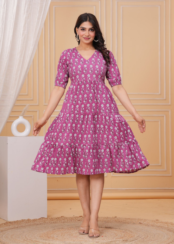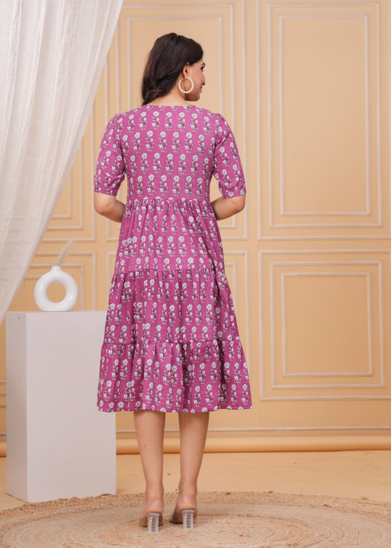 Add a pop of color to your day with this charming magenta purple midi dress featuring a delicate white floral block print. The design showcases a V-neckline and comfortable half sleeves that complement the gathered waist and flowy tiered skirt structure. Perfect for casual outings or daytime events this effortless one-piece combines a relaxed fit with feminine details making it a beautiful choice to wear with heels or flats.