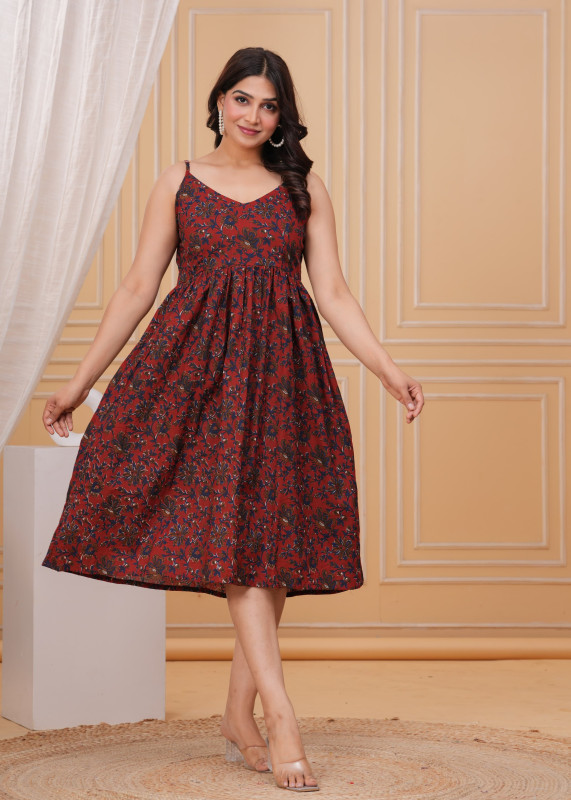 Make a sophisticated statement with this deep maroon midi dress adorned with an intricate blue and beige floral print. The sleeveless silhouette features a flattering V-neckline with delicate shoulder straps and a gathered empire waist that flows gracefully into a voluminous A-line skirt. Perfect for evening gatherings or casual daywear this elegant one-piece combines rich colors with a comfortable fit and pairs effortlessly with heels or flats for a polished look.