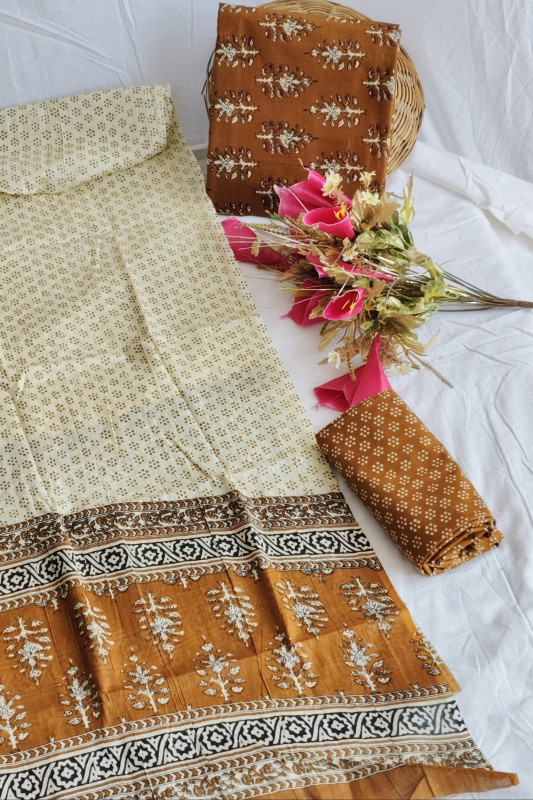 Immerse yourself in the rich heritage of Indian textiles with this exquisite mustard Dabu hand block printed cotton unstitched suit material. Originating from the skilled artisans of Rajasthan, this set showcases the traditional Dabu mud-resist printing technique, where each intricate motif is a unique signature of handmade artistry. The earthy color tones and breathable cotton fabric ensure a blend of timeless style and absolute comfort, making it a perfect addition to your ethnic wardrobe.