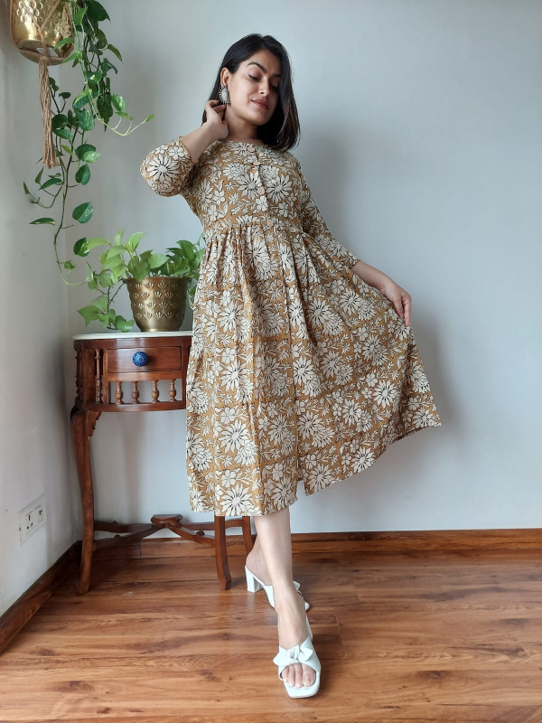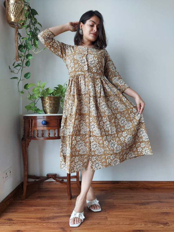 This mustard yellow and white floral print cotton A-line one-piece dress is a charming and comfortable garment crafted from premium, breathable cotton cambric fabric, ensuring a soft, lightweight feel for all-day wear. The base color is a warm mustard yellow/brown, adorned with intricate, large floral motifs in a contrasting white or beige color. These patterns are typically created using traditional hand block printing techniques, a process that gives the garment an authentic, artisanal touch and connects it to the rich textile heritage of regions like Rajasthan. The design follows a flattering A-line silhouette, meaning it is fitted at the bodice and flares out gently toward the hem, providing graceful movement and a relaxed yet elegant fit. Key design details include a classic round neckline, a functional partial front button placket closure, and comfortable three-quarter length sleeves. Many similar styles incorporate convenient side pockets for added practicality. This versatile cotton dress is ideal for a variety of settings, from casual outings and brunches to office wear or evening gatherings, offering both elegance and ease.