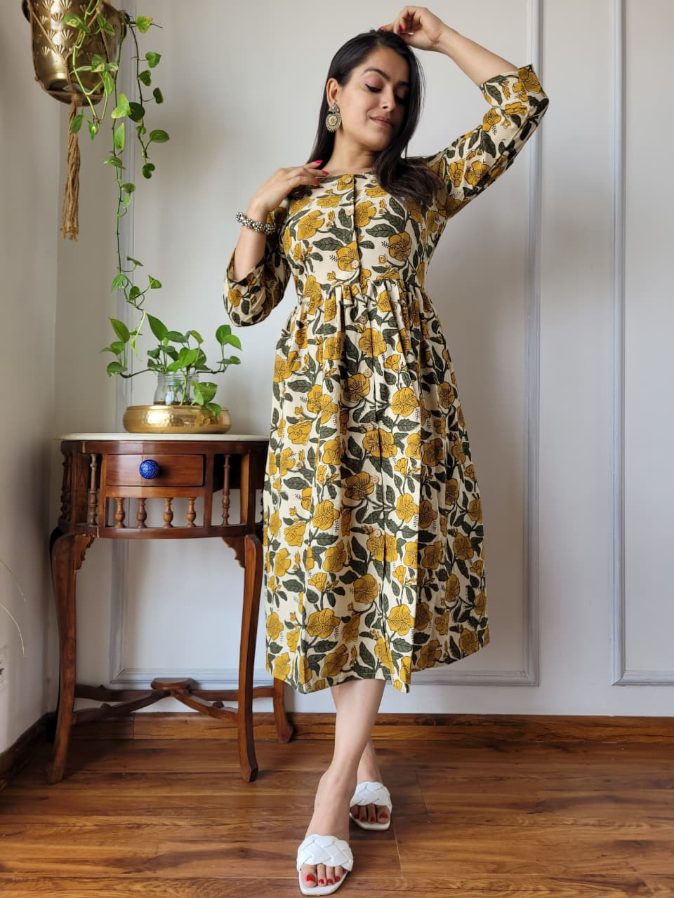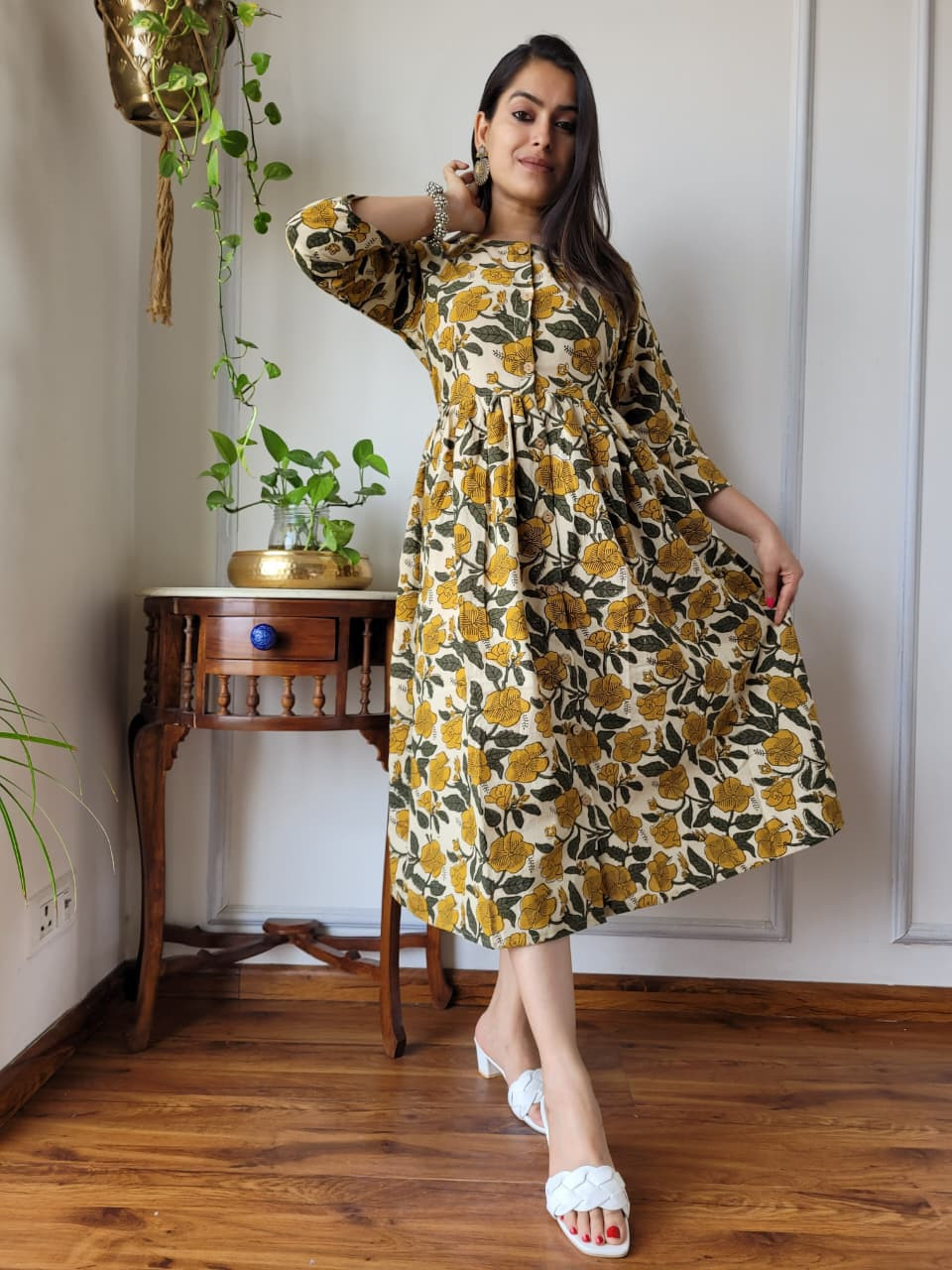 This mustard yellow and white/green floral print cotton one-piece dress is a charming and comfortable garment that effortlessly blends traditional Indian craftsmanship with a modern, flattering silhouette. Crafted from premium, breathable cotton cambric fabric, the dress offers a soft, lightweight feel, ensuring maximum comfort for all-day wear. The base color is a vibrant mustard yellow, adorned with intricate floral and botanical motifs in a contrasting white and green hues. These patterns are created using the time-honored hand block printing technique, a traditional artisan process that involves skilled craftspeople using hand-carved wooden blocks to stamp patterns onto the fabric, ensuring each piece is unique and carries cultural heritage from regions like Rajasthan. The design follows a flattering A-line silhouette, meaning it is fitted at the bodice and flares out gently toward the hem, providing graceful movement and a relaxed yet elegant fit. Key design details include a classic round neckline, a functional partial front button placket closure with contrast buttons, and three-quarter length sleeves. Many similar styles also incorporate convenient side pockets for added practicality. This versatile cotton dress is ideal for a variety of settings, from casual outings and brunches to office wear or evening gatherings