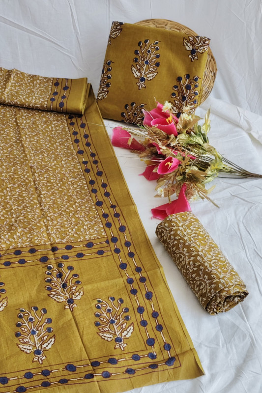 Elevate your ethnic collection with this stunning unstitched suit set, a harmonious blend of traditional charm and contemporary style. Crafted from breathable, premium cotton fabric, the ensemble features a rich mustard yellow base beautifully accentuated with contrasting blue floral and leaf motifs created using the time-honored artistry of hand block printing.