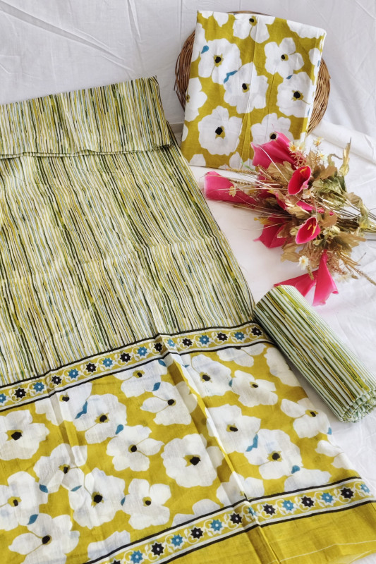 Elevate your ethnic wardrobe with this eye-catching unstitched suit set, a vibrant fusion of cheerful mustard yellow and fresh lime green tones. Crafted from pure, breathable cotton, the ensemble features a striking contrast of patterns: the top and bottom showcase dynamic striped motifs for a modern edge, while the coordinating dupatta is adorned with bold, elegant floral designs. This material provides the ultimate canvas for personalized style, offering generous cuts of 2.5 meters for the top, 2.5 meters for the bottom, and a fluid 2.5 meters for the dupatta, ensuring a comfortable and customized fit tailored precisely to your preferences. Perfect for women seeking a unique blend of traditional comfort and contemporary flair, this suit material is an ideal choice for any daytime event or casual gathering where comfort meets captivating design.