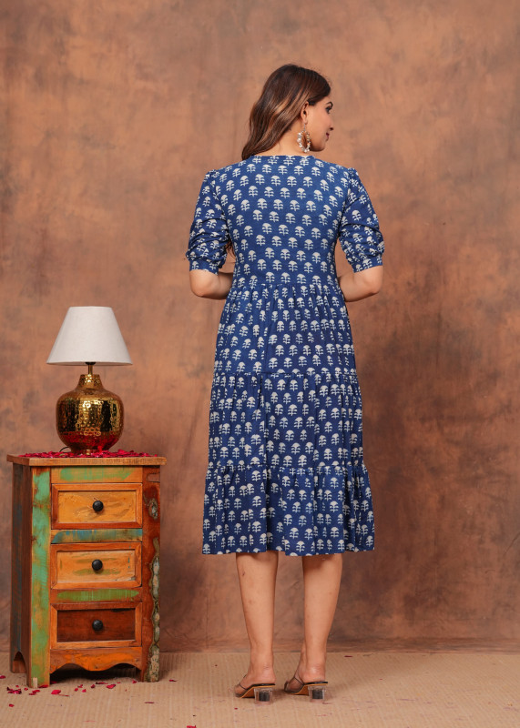Capture a boho-chic vibe with this lovely blue midi dress featuring a repetitive white ethnic motif. The tiered skirt design adds a playful volume to the look while the puff sleeves and notched neckline with a tie-up tassel detail enhance its feminine charm. Crafted for comfort and style this piece is ideal for warm weather and casual hangouts easily styled with wedges or flats for a complete look.