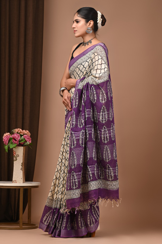 This elegant saree features an off‑white base highlighted with deep purple borders and pallu, creating a rich contrast that looks graceful for both day and evening wear. The handblock printed geometric and floral motifs add an artisanal touch, giving the saree a traditional yet contemporary vibe. Paired with oxidised silver jewellery and a simple blouse, it becomes a perfect choice for festive functions, family gatherings, or cultural events. The overall look is sophisticated, eye‑catching, and ideal for someone who wants a stylish ethnic outfit that still feels classic and timeless.