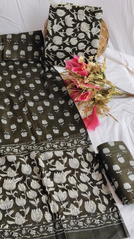 Olive Green Hand Printed Cotton Unstitched Suit Material for women is crafted from premium, breathable pure cotton fabric, renowned for its exceptional comfort and soft feel against the skin. This complete ensemble offers generous 2.5-meter lengths for the top (kurta), bottom (salwar/pants), and the coordinating dupatta, providing ample fabric to be custom-tailored precisely to your measurements and desired style. The rich, deep olive green or khaki base color serves as an elegant backdrop for the striking white and off-white traditional hand block prints, creating a visually appealing and balanced contrast. The design showcases the intricate artistry of authentic Indian hand block printing, a heritage craft from regions like Rajasthan, possibly in the Sanganeri style with delicate floral and leaf motifs spread across the surface of the top and dupatta, and coordinating smaller geometric patterns on the bottom material. This versatile unstitched set is ideal for creating a personalized outfit suitable for everyday wear, casual outings, or even semi-formal occasions, offering a chic blend of timeless traditional charm and modern appeal