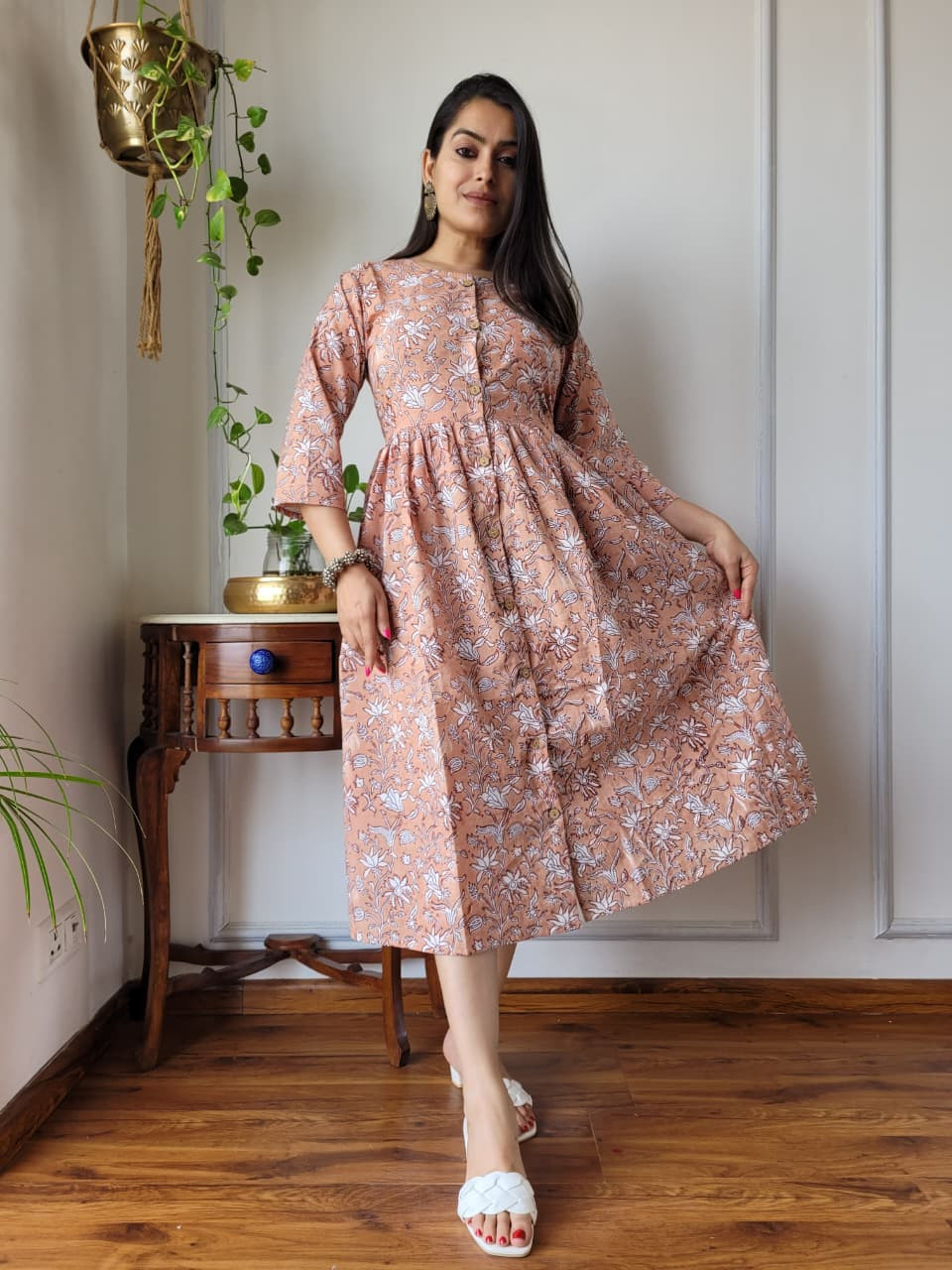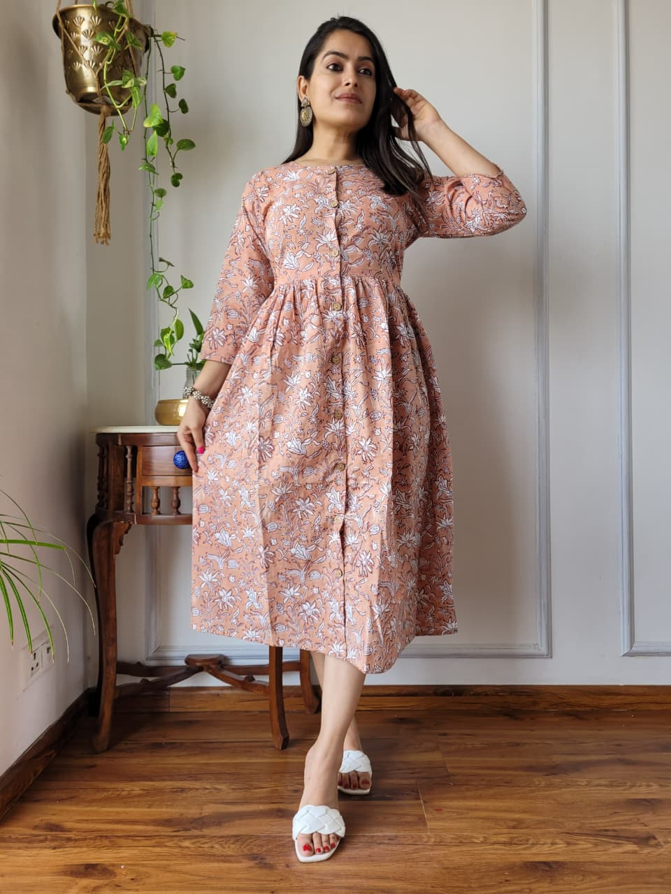 This peach pink cotton hand block printed A-line one-piece dress is a charming and comfortable garment that effortlessly blends traditional Indian craftsmanship with a modern, flattering silhouette. Crafted from premium, breathable cotton cambric fabric, the dress offers a soft, lightweight feel, ensuring maximum comfort for all-day wear. The base color is a delicate peach pink hue, adorned with intricate floral and botanical motifs in a contrasting white color. These patterns are created using the time-honored hand block printing technique, a traditional artisan process that involves skilled craftspeople using hand-carved wooden blocks to stamp patterns onto the fabric, ensuring each piece is unique and carries cultural heritage from regions like Rajasthan. The design follows a flattering A-line silhouette, meaning it is fitted at the bodice and flares out gently toward the hem, providing graceful movement and a relaxed yet elegant fit. Key design details include a classic round neckline, a functional partial front button placket closure with contrast buttons, and three-quarter length sleeves. Many similar styles also incorporate convenient side pockets for added practicality. This versatile cotton dress is ideal for a variety of settings, from casual outings and brunches to office wear or evening gatherings, offering both elegance and ease.