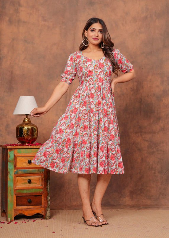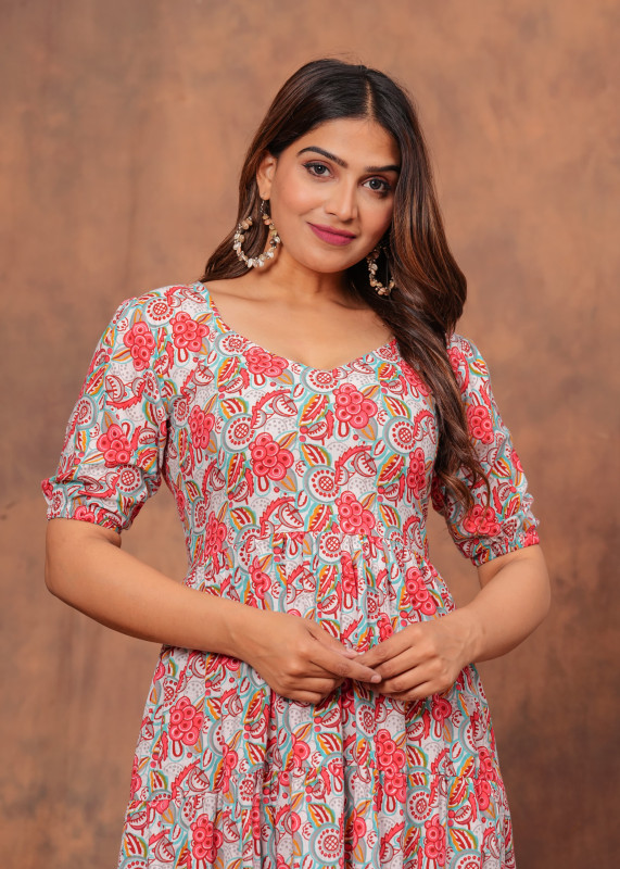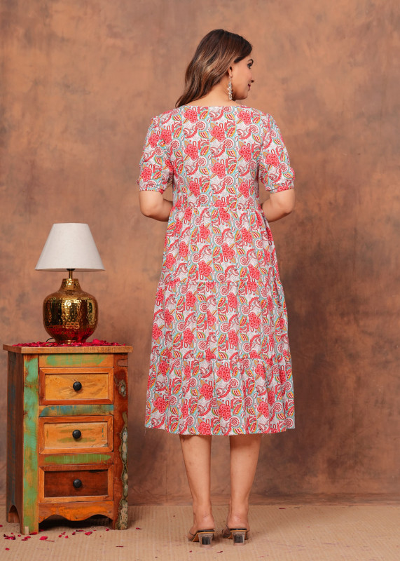 Step into the season with this refreshing midi dress that showcases a dense floral and paisley print in soft pink and teal tones. The design features a flattering wide V-neckline and comfortable half sleeves that perfectly balance the voluminous tiered skirt. With its relaxed A-line silhouette and breathable fabric this dress offers both style and comfort making it an ideal choice for casual days or weekend brunches when paired with simple heels or sandals.