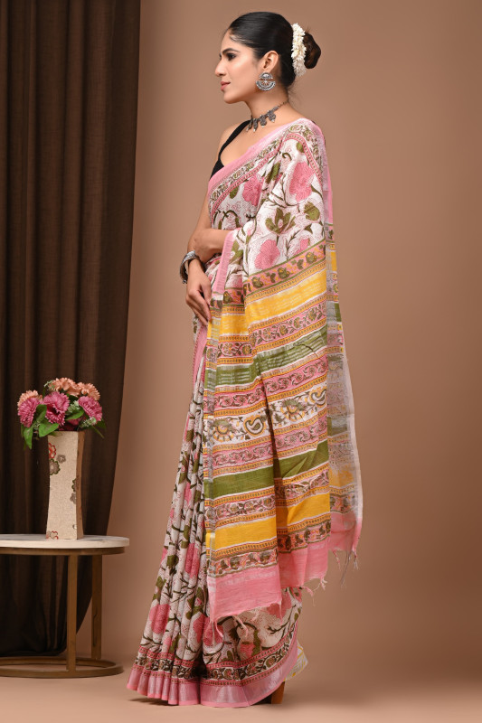 This Pink & Multicolor Handblock Printed Cotton Saree with Floral Body and Traditional Stripe Pallu beautifully blends soft elegance with artistic craftsmanship, making it a perfect choice for everyday comfort as well as festive dressing. The saree features a charming handblock-printed floral pattern across the body, highlighted in soothing pink tones with accents of earthy greens, giving it a refreshing yet graceful appeal. Its pallu stands out with traditional multicolor stripe detailing in hues of yellow, green, and pink, adding a vibrant contrast that enhances the overall design. Crafted from breathable and lightweight cotton, the saree drapes effortlessly, offering all-day comfort while maintaining a refined, polished look. Finished with a pastel pink border that ties the patterns together, this saree is ideal for women who appreciate handcrafted artistry and timeless ethnic fashion.