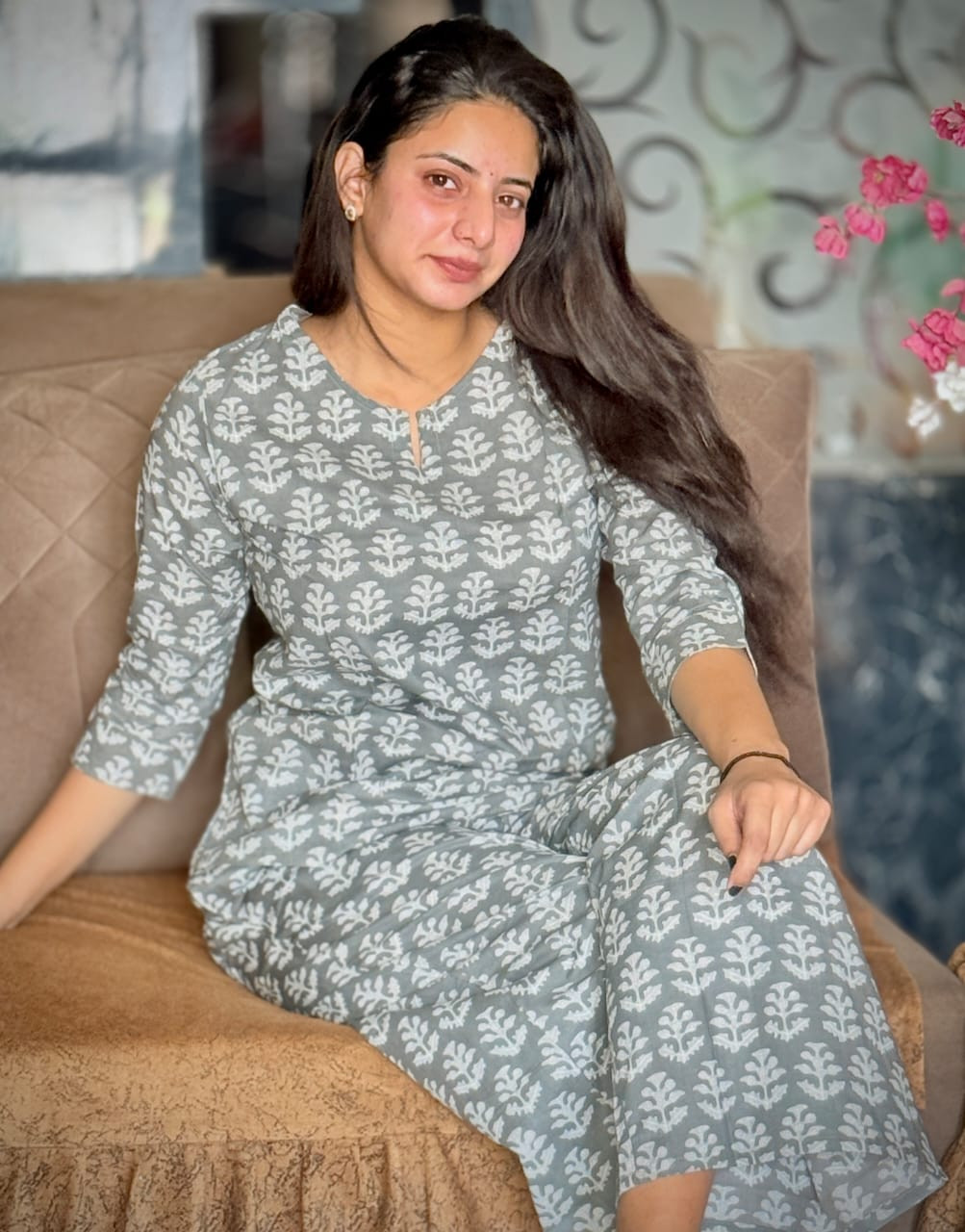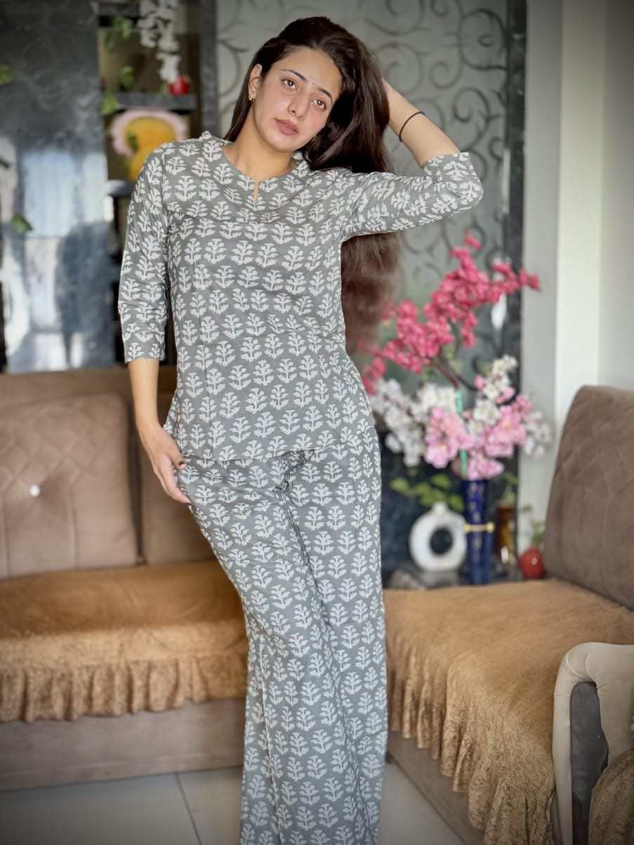 "Embrace the charm of hand-block aesthetics with this refreshing Indigo Lotus Co-ord Set. Set against a pristine cream canvas, the design features bold, artistic floral motifs in soothing shades of indigo and teal, reminiscent of classic pottery art. The top offers a relaxed silhouette with a smart notch neckline and three-quarter sleeves, perfect for keeping cool during warm days. Paired with matching straight-fit trousers, this ensemble is the epitome of effortless elegance. Whether you are working from home or stepping out for a casual lunch, the soft, breathable fabric ensures all-day comfort while keeping you stylishly chic."