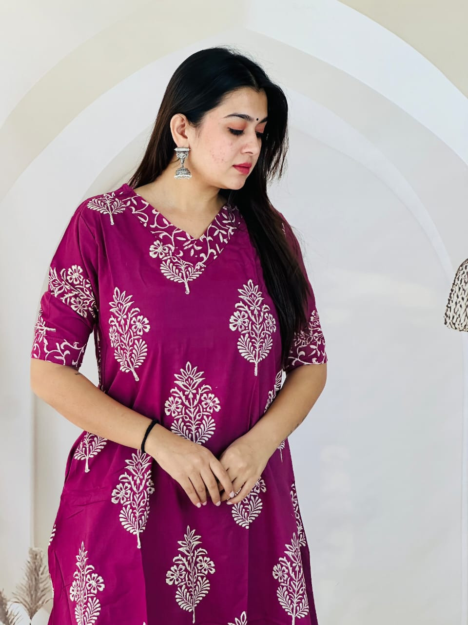 This A-line kurti offers a comfortable and chic blend of ethnic tradition and modern style. The free-flowing, flared silhouette provides ease of movement, and the flattering V-neckline complements various body types. Its versatile design makes it suitable for various occasions, from a day at the office to casual outings or relaxed social gatherings. It can be worn as a standalone dress or, as seen in similar styles, paired with contrasting black or white leggings or trousers for a complete and elegant everyday ensemble.