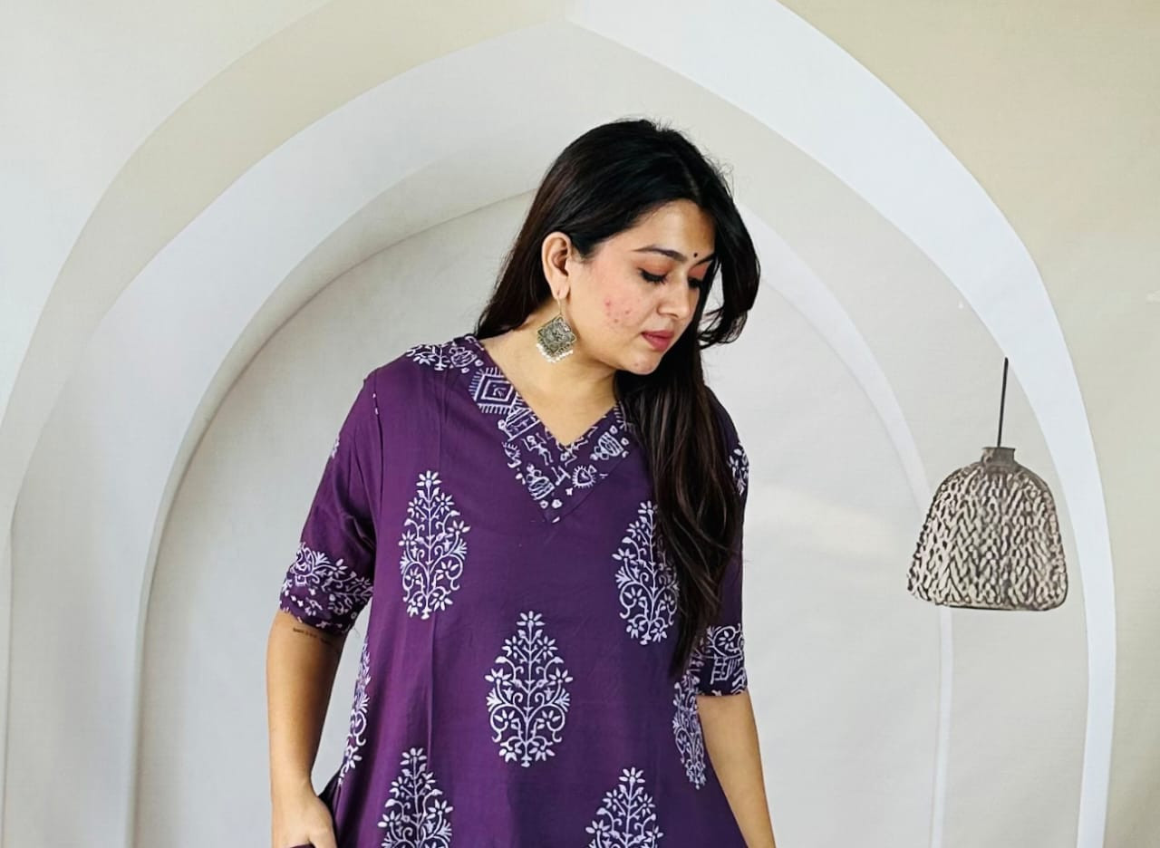 This versatile A-line kurti effortlessly blends ethnic artistry with a comfortable, contemporary style. The light and airy cotton material ensures ease of movement and comfort throughout the day. The flattering V-neckline and elegant design make it suitable for various occasions, from casual outings to office wear or relaxed social gatherings. It is commonly paired with black leggings, as shown, or with white trousers for a complete and chic Indo-fusion look