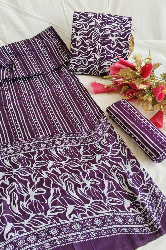 Enhance your style with this attractive Purple and White Hand Block Printed Cotton Unstitched Suit Set. Crafted from premium, breathable cotton fabric, this ensemble provides unparalleled comfort all day long and a soft feel against the skin. The unique feature of this set is the intricate hand block printed designs, which give a traditional and artistic look. This is a complete unstitched dress material that includes a 2.5-meter top fabric, a 2.5-meter bottom fabric, and a 2.5-meter matching dupatta, giving you complete freedom to stitch it according to your preference and measurements. Whether you want to create a classic salwar kameez, a stylish palazzo suit, or a contemporary A-line ensemble, this set provides the perfect base. Ideal for casual outings, office wear, or small family gatherings, this suit set is a great blend of comfort and style
