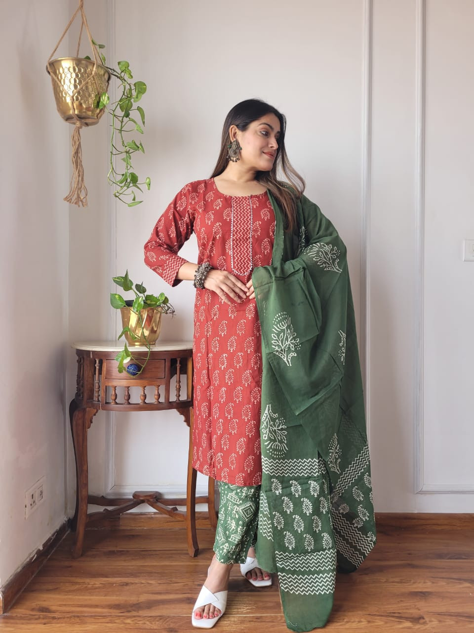red and green hand block printed cotton kurta, pants, and dupatta suit set