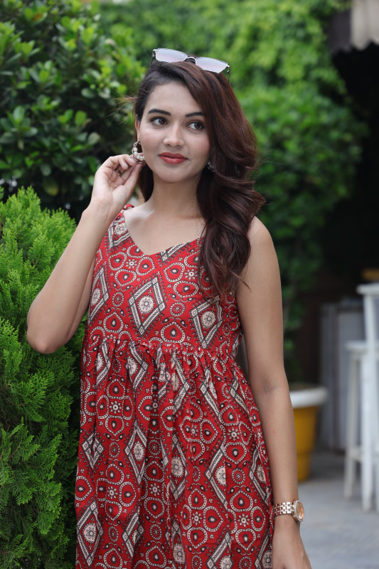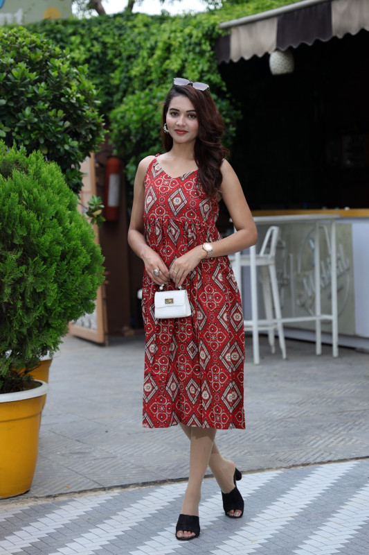 This vibrant one-piece dress is crafted from high-quality red cotton fabric and features an intricate all-over geometric diamond block print in earthy cream and black tones. The garment is designed with a sleeveless silhouette and a classic V-neckline that flows into a gathered waist, creating a comfortable and flattering A-line fit. Falling to a midi length, the dress offers a stylish and breathable option for casual outings, summer parties, or daytime social events. The soft cotton material ensures ease of movement while the traditional print provides a beautiful ethnic touch to a modern western silhouette. This versatile piece is easy to wear and can be perfectly paired with simple flats and minimal jewelry for a complete and polished look.