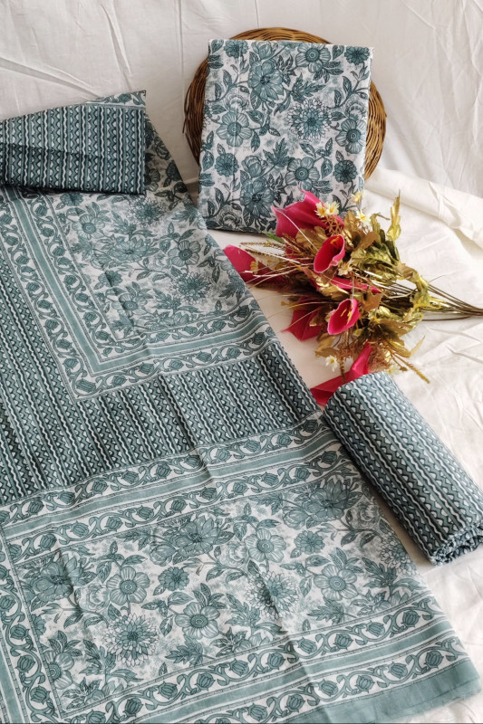 Experience effortless elegance with this stunning sea green unstitched suit material set, thoughtfully designed with a serene blend of floral and wave hand block prints. The premium cotton fabric feels soft against the skin, making it a perfect choice for warm days as well as comfortable everyday wear. With 2.5 meters each of top and bottom fabric, along with a 2.5-meter flowing dupatta, this set offers complete flexibility to stitch your outfit exactly the way you like—be it a classic salwar suit, a straight-cut kurta, or a comfortable daily-wear style. The calming sea green shade paired with its artistic hand block detailing adds a refreshing charm, giving the ensemble a naturally graceful look. The dupatta carries coordinated prints that enhance the outfit with a light, breezy elegance. Ideal for work, casual outings, small celebrations, or relaxed festive days, this suit material set brings together comfort, craftsmanship, and subtle beauty, making it a delightful addition to any wardrobe.