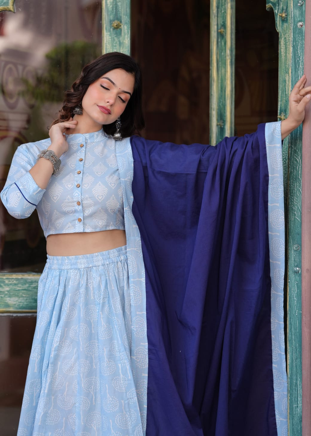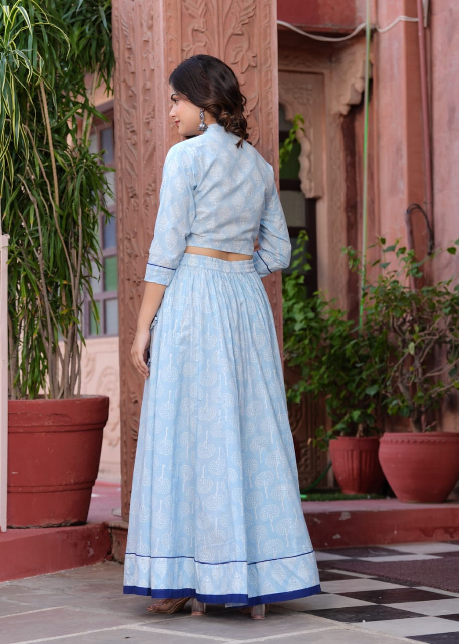 This graceful ethnic outfit features a light sky blue cotton lehenga and matching choli set adorned with delicate white tree and floral block prints. The top is a stylish mandarin collar crop choli with a button-down front, measuring 15 to 16 inches in length and available in sizes 36 to 46 (S to 3XL). The coordinating skirt is 40 inches long and is designed with 28 kalis to create a wide 5.5-meter flair that provides a beautiful drape and movement. To create a striking contrast, the set includes a 2.5-meter solid dark navy blue dupatta finished with a printed sky blue border. This lightweight and breathable ensemble is perfect for daytime functions, festive gatherings, or casual ethnic wear during the summer season.