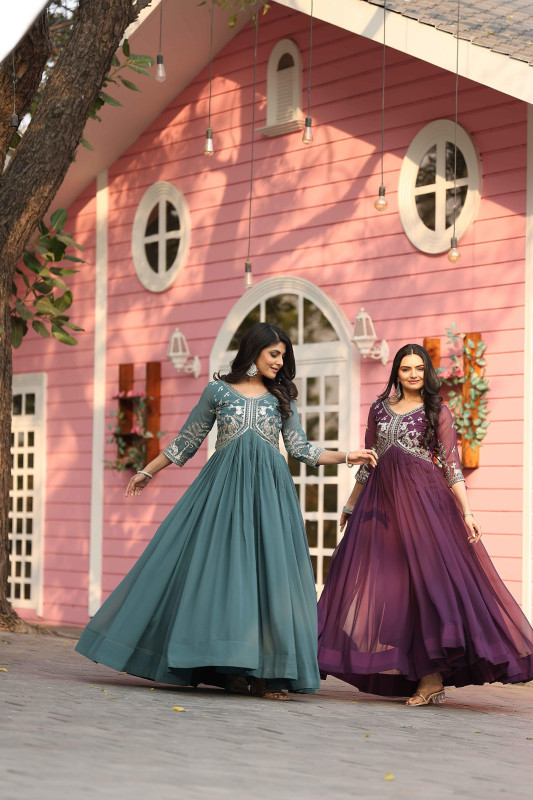 Teal Blue Faux Georgette Embroidered Anarkali Gown, designed to make a lasting impression at any special occasion. The gown is crafted from premium-quality faux georgette fabric, known for its lightweight and ethereal drape that flows beautifully and moves gracefully with every step, and is lined with soft micro cotton inner lining for comfort. The rich, deep teal blue hue provides a sophisticated backdrop for the intricate craftsmanship. The bodice features detailed resham (thread) and sequin embroidery work, strategically placed with motifs that appear to include deers and floral patterns, to catch the light and add a touch of glamour and luxury. The Anarkali silhouette boasts a generous 4-meter flare and a length of approximately 58 inches, enhancing its regal, floor-length look. This ensemble is a perfect choice for various events, including festive celebrations, weddings, receptions, and evening parties, and often comes complete with a matching faux georgette dupatta featuring coordinating work, ensuring you stand out with timeless beauty and grace