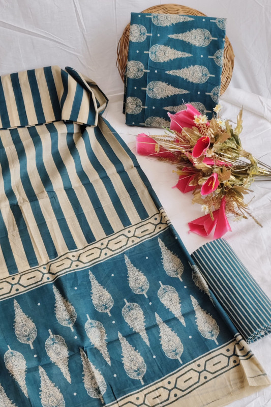 This beautiful unstitched suit material set features a stunning teal base enhanced with hand block printed stripes and delicate leaf motifs, offering a perfect blend of elegance and tradition. Crafted from premium-quality cotton, the fabric is soft, breathable, and comfortable for all-day wear, making it ideal for every season. The set includes 2.5 meters of top fabric, 2.5 meters of bottom fabric, and a 2.5-meter dupatta, giving you ample material to design a personalized and perfectly fitted outfit. The vibrant teal color combined with the intricate block print adds a refreshing charm, making this suit material suitable for casual outings, festive gatherings, and daily wear. With its graceful patterns and high-quality craftsmanship, this teal hand block print suit set brings a touch of ethnic beauty and timeless style to your wardrobe.