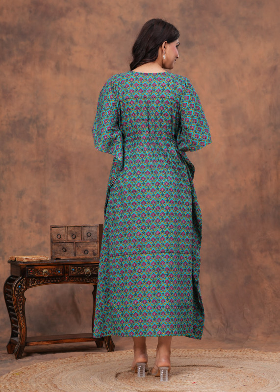 This stylish and comfortable garment is typically crafted from lightweight, breathable 100% cotton fabric, which provides a soft and airy feel against the skin. The design features a loose, flowing silhouette with a V-neckline and wide, kimono-style sleeves, built for maximum comfort and ease of movement. It includes a functional, adjustable drawstring or tie-up detail at the waist, which allows the wearer to customize the fit to flatter various body types. The vibrant turquoise backdrop is adorned with intricate floral and leaf patterns, often in contrasting colors like pink, red, and yellow, creating a refreshing and eye-catching design. This versatile piece is suitable for a range of uses, functioning well as casual wear, loungewear, a beach cover-up, resort wear, or comfortable nightwear.
