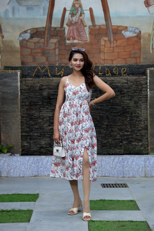Radiate summer elegance with this breezy white midi dress featuring a vibrant floral print in pink and blue tones. The design includes a soft V-neckline and adjustable spaghetti straps that lead into a gathered empire waist, creating a comfortable and flowy A-line silhouette. A stylish side slit adds a modern touch and ease of movement, making this one-piece perfect for beach vacations or casual outings when paired with heels or sandals.